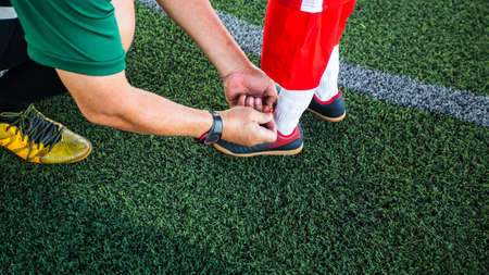Coach sitting and tying sport shoelaces to kid soccer player before training football.