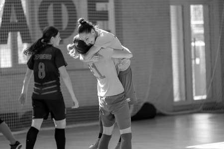 ODESSA, UKRAINE - March 13, 2020: Futsal Cup of Ukraine, futsal among students. During final match in futsal among student teams. Beautiful sports girls play mini football on parquet floor