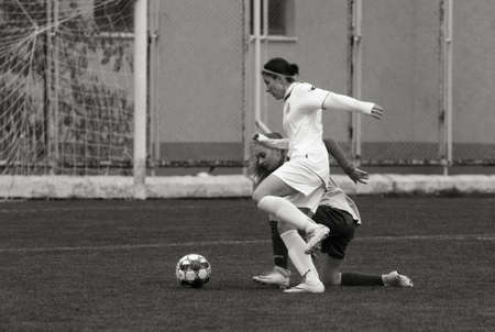 ODESSA, UKRAINE -31 DECEMBER 2021: Women's football on grass field of stadium. Football Championship among women White - FC Chernomorets Odessa - Yunost Chernigov. Game moment of girls football