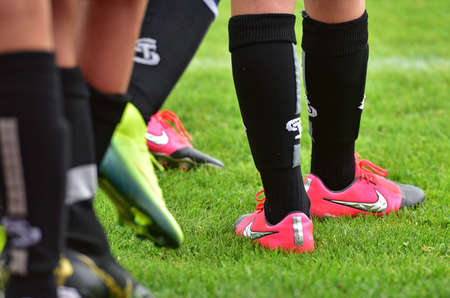 Kids on soccer training. Soccer players standing in a row. Low angle image of footballer's legs in a sportswear and cleats. Colorful soccer clothing