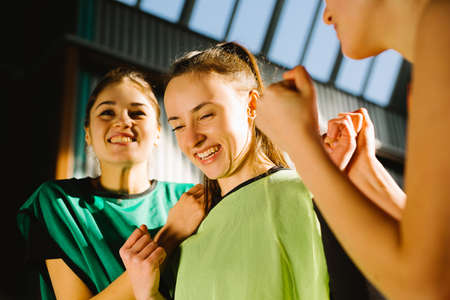 Portrait of a happy girl with her friends having fun together during sports training outdoors
