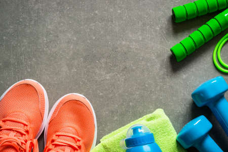 Pink dumbbells, sport bottle, towel and black running shoes on the sport mat