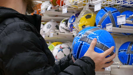 A man in a store chooses a soccer ball for his son. Buying a sword in the sports section of the store, a man tosses a blue leather ball. The buyer chooses a soccer ball to have fun with the team.