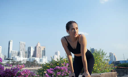 Young woman athlete running resting exhausted after a cardio workout exercise in the urban city sunset. Jogging lifestyle healthy.