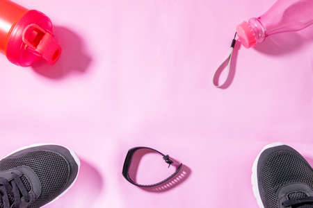 Top view of sport accessories with copy space. Running shoes, bottle, earphones, on pink background