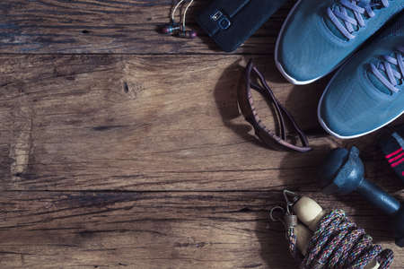 Top view of sport shoes, sound headphone, smartphone, hat, towel and water bottle photographed on an antique wooden table. Text space.
