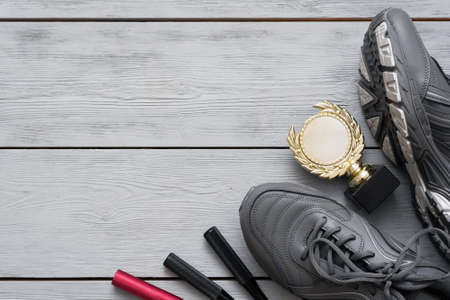 Sport shoes and golden award trophy on the wooden flat lay floor background with copy space.