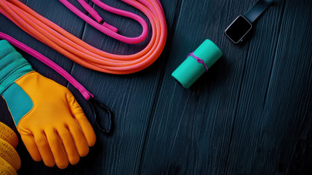 A pair of bright-colored workout gloves, a jump rope, and a fitness tracker laid out on a gym floor