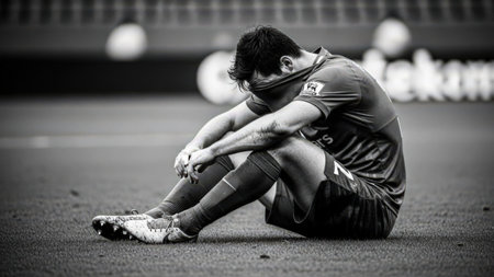A soccer player is seen sitting on the field, appearing to be in distress or pain. He is wearing a soccer uniform and has his hands on his knees, with his head bowed down. The image is in black and white, capturing the intensity and emotion of the moment.