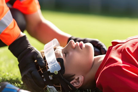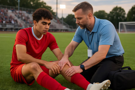 Team doctor examining the knee of an injured football player during a pre game medical check on the field, ensuring proper care and assessment
