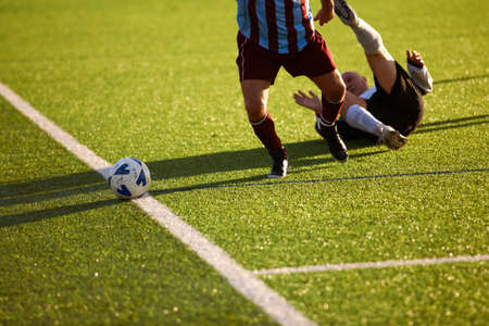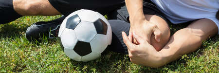 Close-up Of Male Soccer Player Suffering From Knee Injury Lying On Field