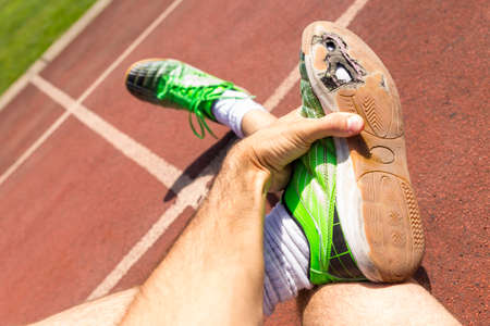 An exhausted athlete on a running track wearing broken green running shoes with big holes in the sole.