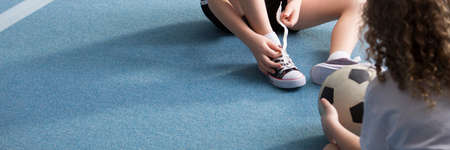 Panorama of boy tying his shoes and his friend sitting with a football