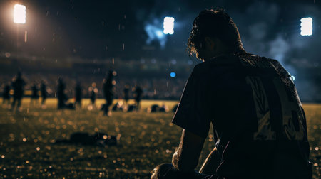 A photo capturing the somber moment of a team facing defeat, with a focus on a single player showing resilience, reflecting on the loss but ready to rise again, symbolizing the strength found in adversity.
