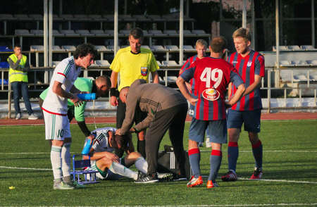 LEGNICA, POLAND - JUNE 2, 2020: Match Polish football Fortuna 1. League between Miedz Legnica vs PGE FKS Stal Mielec 1:2. In action medical staff helps Bartlomiej Kielbasa