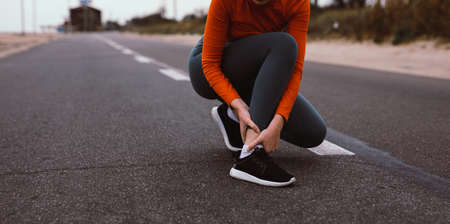 Cropped shot of runner woman suffering from knee pain and she wearing knee braces for supports to be worn when you have pain in your knee.