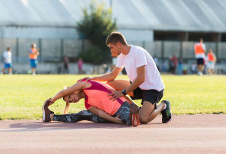 This is what happens when you dont stretch properly. a sports paramedic providing first aid to an athlete on a running track.