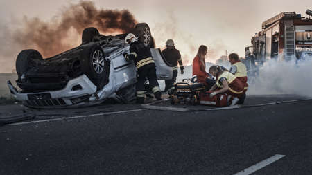 Car Crash Traffic Accident: Paramedics and Firefighters Rescue Injured Trapped Victims. Medics give First Aid to a Female Passenger. Firemen Use Hydraulic Cutters Spreader to Open Vehicle