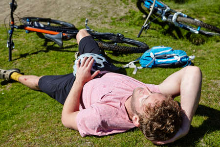Cyclist lying down on grass by bicycle