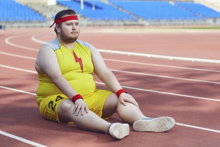 A fat lazy man sits on a track at a stadium in the summer. Weight loss concept.