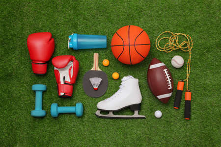 Different sport equipment on green grass, flat lay