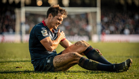 A professional rugby player sits on the grass in pain clutching his injured shoulder after a hard tackle on a muddy field during a high-intensity match symbolizing resilience and the physical toll of.