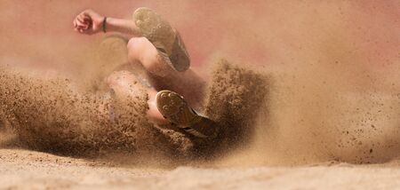 Female athlete long jump landing sand spray