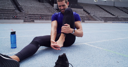 Exercise, foot pain and man in stadium for accident, emergency or physical risk with training. Fitness, injury and massage with athlete or runner on track at venue for fatigue or muscle cramp