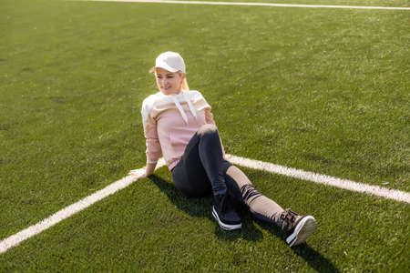 Young beautiful blonde hair fitness girl doing stretching on the stadium. sport activity. Green stadium grass on background.