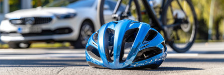 Bicycle helmet on city street after car accident, promoting urban safety measures