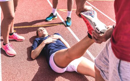 Female athlete injured on athletic run training - Male coach taking care on woman having fatigue cramps - Sport team concept with young sporty people facing mishaps casualties - Contrast filter
