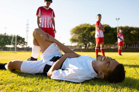 Multiracial male players looking at injured rival lying on grassy field at playground during match. Copy space, summer, pain, unaltered, soccer, sport, team sport and competition concept.