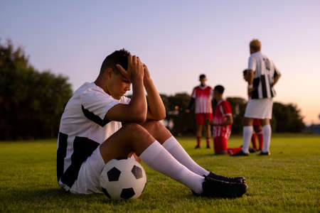 Side view of caucasian sad male player with head in hands and ball sitting on field at sunset. Copy space, playground, frustration, loss, stress, unaltered, soccer, competition and sport concept.