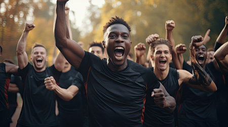 Competitive sport success Men soccer team cheering under spotlight outdoors generated by artificial intelligence