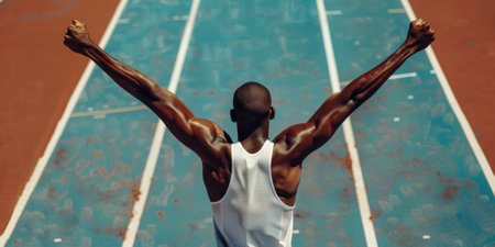 A dynamic shot of a runner crossing the finish line with their arms raised in triumph.