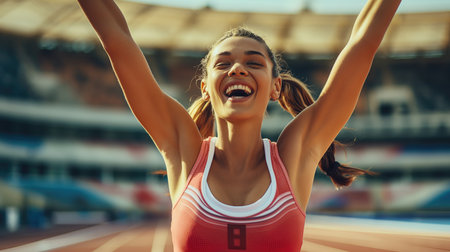 Woman athlete celebrating success and achievement on a stadium track with her arms raised