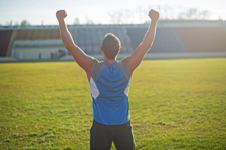 Athletic man is happy and rejoicing at the stadium, raised his hands up. Winner.