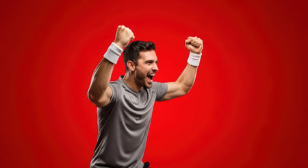 A man in a red shirt is raising his arms. Generative AI image.