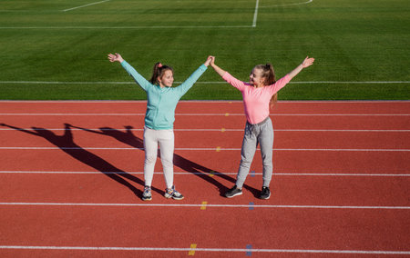 Sports really strengthen friendship. Happy friends hold hands on athletics track. Friendship concept