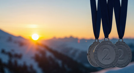 The golden hour light baths a serene winter mountain range where a bright sun descends behind distant peaks, creating a dramatic and inspiring backdrop for second-place achievement awards.