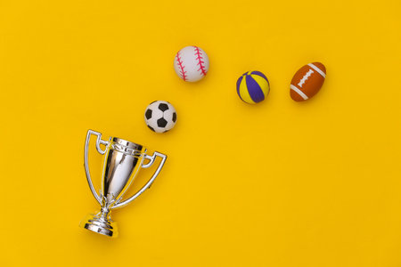 Mini different sports balls and champion cup on yellow background. Minimalism Sport concept. top view. flat lay.