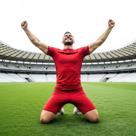 The image depicts a triumphant athlete kneeling on a lush green field with arms raised in celebration. The athlete is wearing a red sports uniform and is positioned in the center of a large, empty stadium. The stadium's seating is visible in the background, adding to the sense of accomplishment and solitude. The athlete's joyous expression and posture convey a moment of victory and achievement.