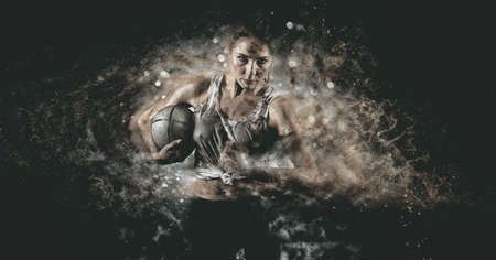 Sportsmen playing basketball, tennis, soccer football, gymnastics on black background in mixed light.