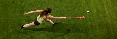 Overhead view of player mid-strike on green grass field against white studio background, symbolizing coordination timing and game execution. Concept of sport events, competition, championship, game