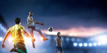 Multiethnic professional soccer football players in football kits in motion with ball over colorful background in neon. Sport, competition, championship, wow