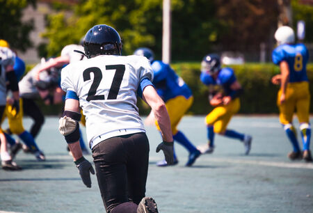 Young man american football player at stadium in motion. Action, activity, sportlife concept. Flyer for ad, design.