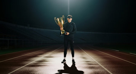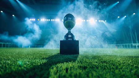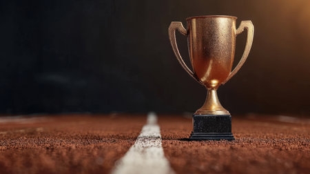 Golden trophy standing in a stadium, representing victory, achievement, and the culmination of hard work and dedication in a sporting event