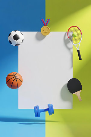 Various sports items like a football, tennis racket, dumbbells, and a yellow ball are neatly organized with a clear space for additional text.