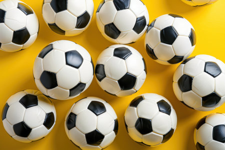 A flatlay of multiple soccer balls arranged on a yellow background.