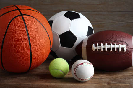 Various sports balls, including soccer, basketball, and baseball, arranged on a wooden table in a cozy environment.